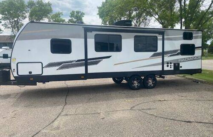 Brand New 2023 top of the class Radiance R28QD with upgraded New memory foam mattresses in masterbed room. 1 Power slide outs. Master suite includes overhead shelf with outlet and side wardrobes. Large Bathroom with high pressure shower head. Main quarters include a 40” TV, Upgraded Fridge, gas stove top, microwave, Dining table and Couch.