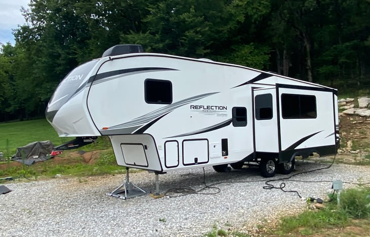 This is our new 2023 Grand Design. It is 2 bed one bath 5th wheel that sleeps about 8. This a great camper for the family. It has an outside kitchen that has a small fridge and a flat top stove.