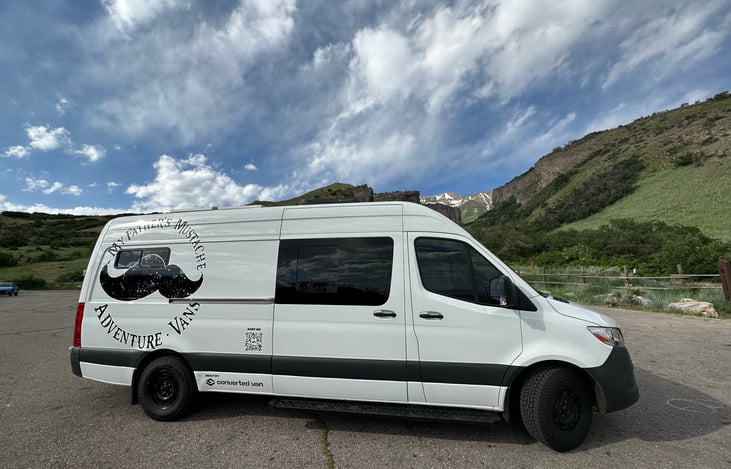 The ultimate family getaway vehicle! My Father's Mustache vehicle, aka Blitz, is a tricked-out Mercedes sprinter by Converted Van Co. Everything you'll need is contained in this clean build! Equipped with AC/heater, max fan, fridge, microwave, induction stovetop, water heater, sink/grey water tank, and shower option! Sliding windows. Removable/adjustable seating/dining table. Dry flush toilet.