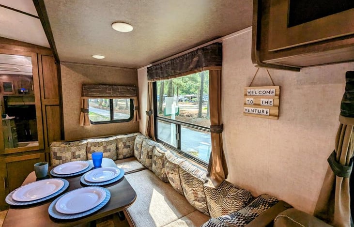 The Venture is a family friendly RV that sleeps 8 comfortably, is easy to tow and can be towed with a half ton truck or large SUV with a towing package. Equipped with televisions, Bluetooth capable radio, linens, towels, cutlery, COFFEE MAKER and more. Outfitted and ready for your next adventure!
