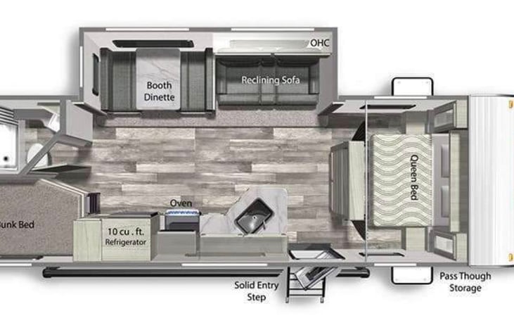 Very nice trailer! Includes bunk beds and a queen bed, couch and table. This is a very spacious trailer and includes amenities such as an installed tv (not shown in picture), full bathroom, oven/stove, microwave and much more. The trailer is stocked with supplies that you may need such as towels, dishes, and commonly forgotten items for free, so you can enjoy your trip without any stress.