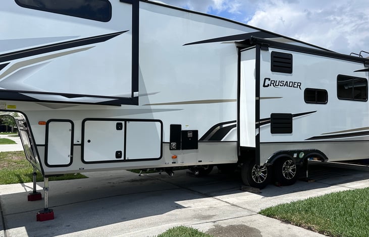 Brand new 2022 Prime Time Crusader fifth wheel. sleeps 4 with king size bed and pull out bed. Residential size microwave, stove and 12 cubic ft refrigerator. Full size shower with seat shower. Dining area with bench and 2 pull out chairs. Plenty of storage underneath to store extra gear. HUGE closet in bedroom for clothing or extra space to store your items.