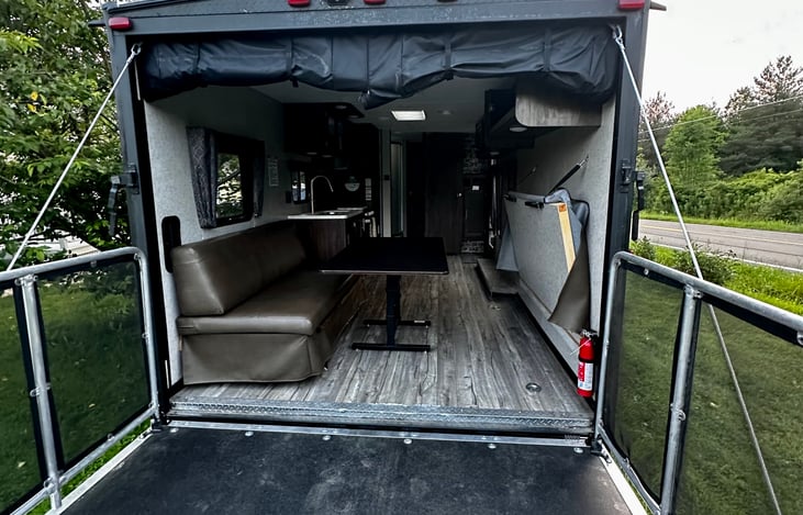 Drop the rear ramp to load up your favorite bike for a weekend of fun with this Cherokee Grey Wolf toy hauler. This model features plenty of space allowing you to fit a couple of dirt bikes, a quad, and more for a great time for you and your family or a few adventurous friends.