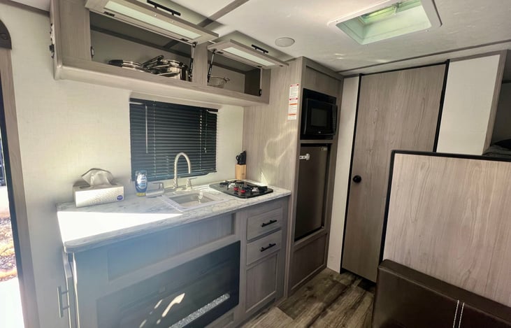 hi, we have our 2024 camper available for use. this camper will sleep 5 guests comfortably between its 4 beds, 2 of them are the twin-sized bunkbed, a dinnet/bed conversion, and a queen-sized bed. perfect for any small family.