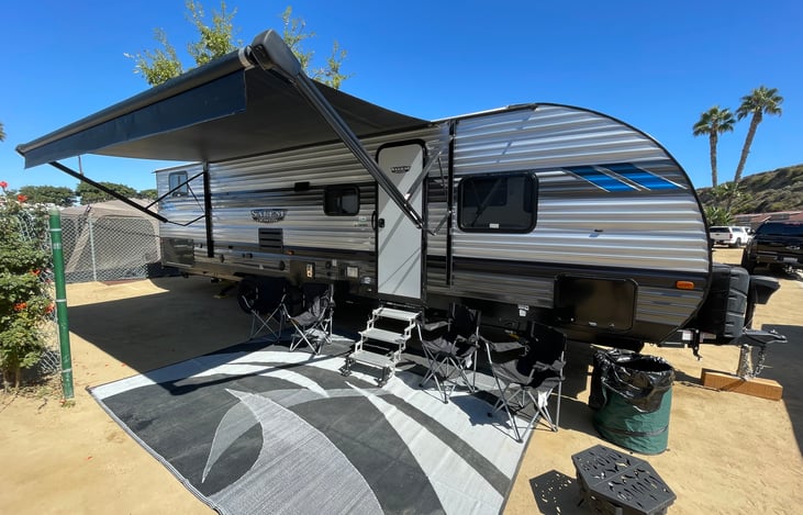 This beautiful travel trailer is the perfect vacation on wheels for families looking to get away from the city life. With 4 bunks in the back, the kids are able to take a nap without being disturbed. Living in the Riverside County area leads to many close camp sites and hideaway spots to camp.