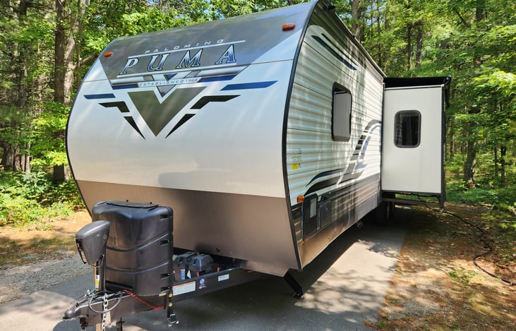 36' Bunkhouse almost new. 2022 Puma 28BHSS, has 1 slide-out. Front bedroom for the parents, rear bedroom for the kids. This RV will sleep a family of 6 comfortably, a family of 10 will probably be a bit cramped. We replaced the factory queen mattress with a thick memory-foam mattress. Nice bathroom with shower stall. Electric fireplace. Outside kitchen w/ mini-fridge and outside shower.
