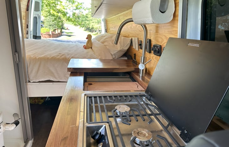 This 2021 Mercedez Sprinter, AKA Mermaid, is the only one of our vans with 5 seatbelts, making it perfect for family trips! It is well equipped with shower, toilet, fridge/freezer. You can cook with the microwave, propane cooktop, or camp stove. Powered with shore power, DC-DC charger, and solar panels.