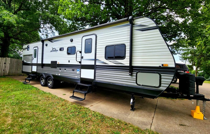 Our 2022 Jayco 32BHds is prepped to sleep up to 10 people. This beauty has two private rooms, one has a (1) queen bed and the other, a bunkhouse, has (1) King size foldout bed and (2) twin size bunk beds. In the main living area, there is (1) full size dinette that converts to a bed and (1) Trifold couch that turns into a Queen-size bed.