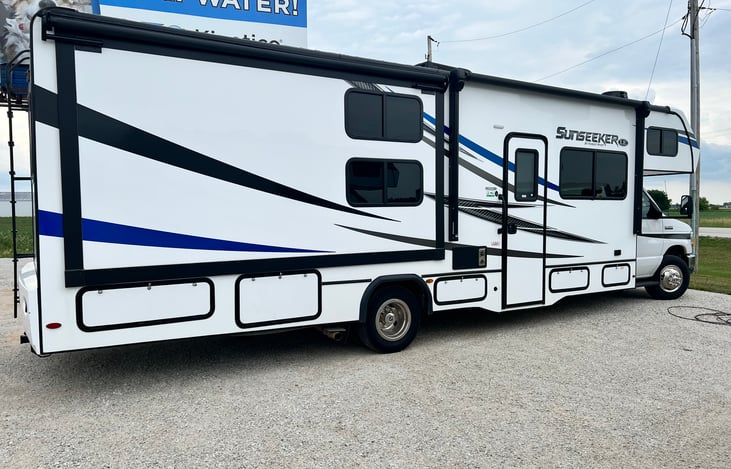 This Class C RV is 32ft long, and comes fully equipped with most amenities and camping accessories. It has an extra set of bunk beds giving this RV 6 separate sleeping beds. Large group? This is what you need! It sleeps up to 11.