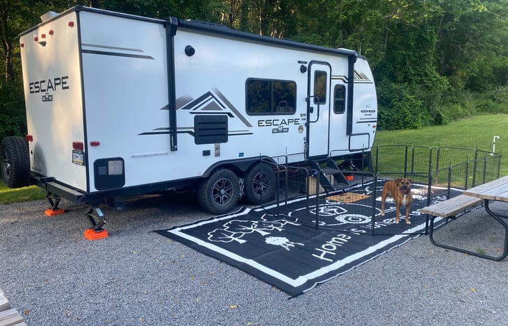 "Our Great Escape" is a 2021 travel trailer that is great for couples or a small family of 4. It's equipped with a very comfortable queen-sized bed (Brooklyn Bedding Mattress), jack knife sofa and convertible dinette. It has all the amenities such as heat, a/c, sink, stove, microwave, and some luxuries, like an air fryer and ice maker (for you bartenders) and a Keurig.