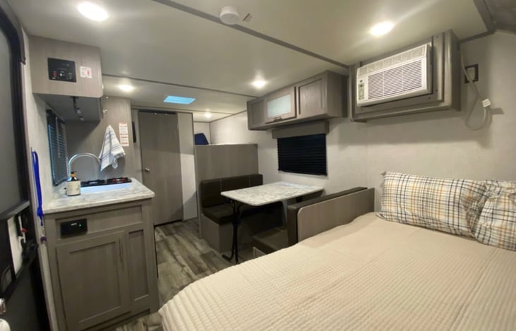 This like new camper sleeps 4 comfortably (can sleep up to 5) and includes one queen bed, a set of bunk beds, and an optional fold-down dinette bed.