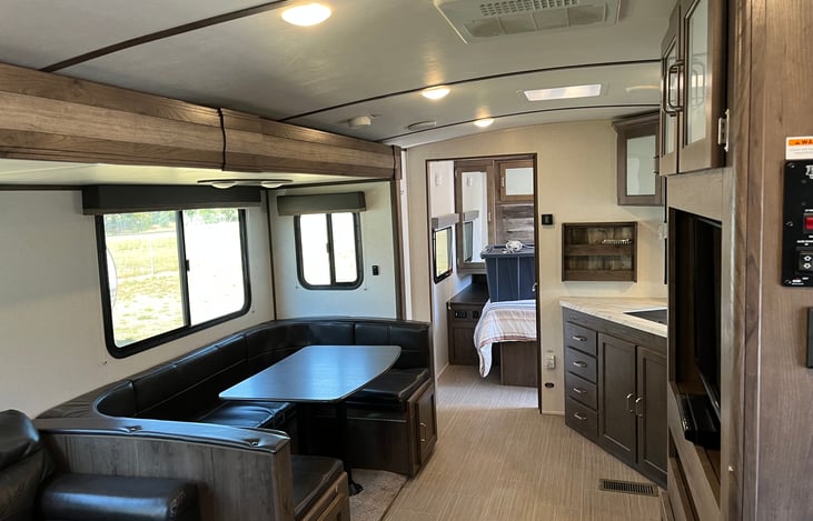 Spacious Living: With a large slide-out, the living area offers ample space, featuring a comfortable sofa and a dinette that can be converted into additional sleeping quarters.