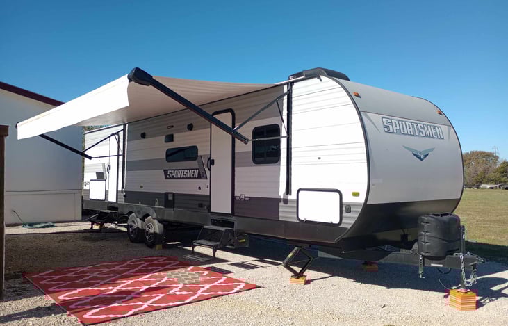 Our travel trailer is very well kept and spacious with one private queen bed in the front and a four-bed bunkhouse in the back (two bunks are 40”x70” and the other two bunks are 34”x72”). It has two slides on the driver’s side. One expands the living/kitchen/dining area, and the second one expands the bunkhouse.