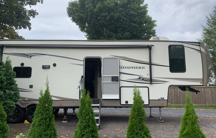 Beautiful 2021 Forrest River Salem Hemisphere 5th wheel RV featuring an impressive floor plan with main bedroom and bathroom at one end, a beautiful living/dining area, and an oversized bunk area with its own bathroom at the other end. Comfortable sleeps 10 people. Includes outdoor kitchen with grill and sink and comes fully stocked with dishes and cookware.
