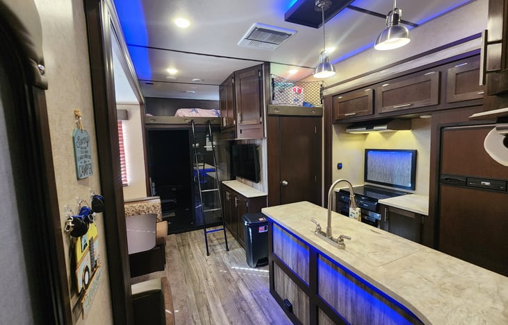 Nice camper for a fun family vacation. Double awning and double entry/exit doors. Back bedroom separated by sliding glass door with privacy curtain has Queen bunk beds, tv, clothing storage, and half bath. Private main bedroom has Queen bed, tv, double closets, and cabinet storage.