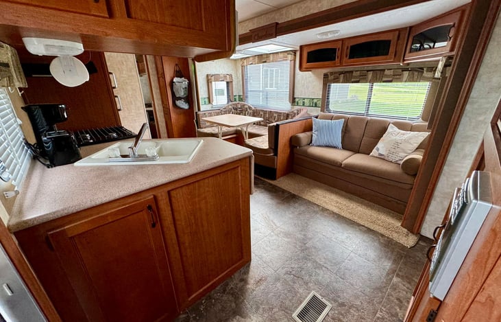 Welcome to our travel trailer which is fully stocked with bedding for all sleeping areas, kitchen utensils and cooking items, 2 Roku TVs, in camper entertainment items, bathroom and general cleaning supplies, as well as outdoor rug and chairs. The unit comfortably sleeps 8 people, but can sleep up to 11. Fully functioning air conditioning, refrigerator, and other kitchen appliances.