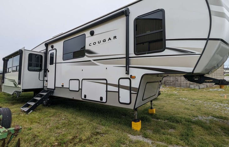 Thanks for taking a peek at our rig. 2023 Cougar 368MBI (40ft) sleeps 10 (lets say 6-7 comfortably :). Four slides open up the floorplan for plenty of space.