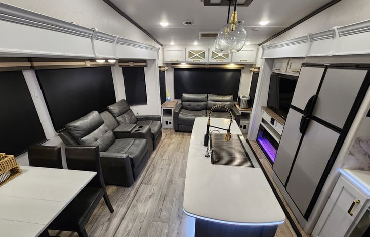 Fully Stocked--Includes linens, dishes, cookware and supplies. Setup included in delivery. Filtered drinking water, Queen bed master bedroom, 2nd bedroom pull out couch, + loft to sleep 2 or three more small kids. His & her recliner, modern design, comfy stay, fire place, 55 inch TV, couch and two recliners. Outdoor TV setup. Two awnings. His and hers bathroom sink.