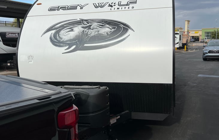 Our brand new 23 Grey wolf is only 24 feet long but has a rear queen bed slide out that allows for more space without additional tow length. Sleeps 8 with 2 queen beds, a single bunk and a dinette and couch that covert to additional beds.