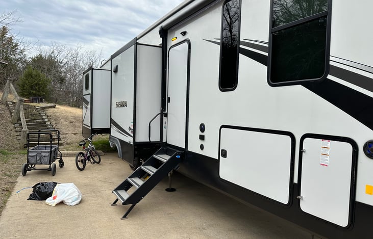 Rent this for your next family getaway. This 41 ft RV has plenty of space for everyone and includes 3 TVs, a full-size stove and refrigerator, a walk in shower, a private spacious master bedroom, private bunk room for the kids with a large play area, and a great outdoor kitchen and grill.