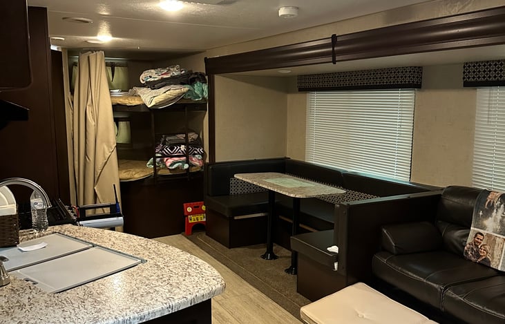 Our like- new bunkhouse camper comes with 2 full propane tanks and all of the necessary hookups and camping essentials to make your stay comfortable! Just bring your own blankets, pillows, food/drinks! Please don't hesitate to reach out and let us know if you have any questions. We are excited to help you enjoy your vacation!