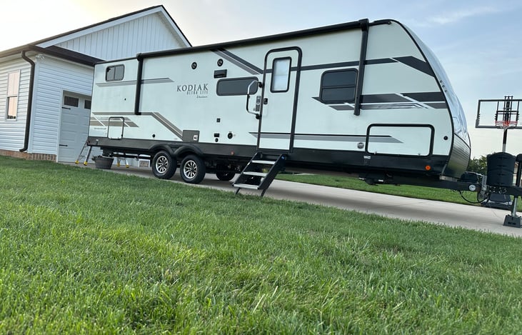 2021 Dutchmen Kodiak Ultra-Lite 283BhslComes with Blackstone that quick connects to gas. All necessities including toilet paper, paper towels, cups, plates, bowls, blankets, sheets, beds made, and etc.Also has 3 TVs with YouTube TV, Hulu, Disney +, Prime Video, and Netflix. Has TV mount outside to be able to bring one outside.