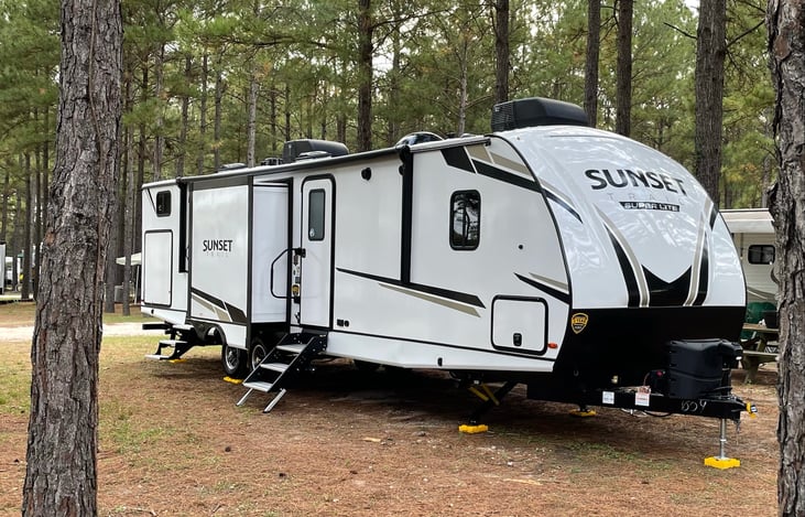 We have traveled the country in our rv trailer making a ton of family memories! Enjoy this trailer with up to 8 people. It offers 1 king, 1 queen pull out bed, and 3 bunks! There is a full size indoor kitchen and a mini out door kitchen. All hook-ups included!