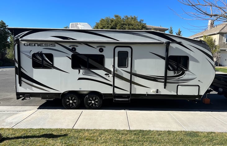 Our toy hauler provides all the comfort of home while you are camping. This toy hauler comes with a private bedroom including wardrobe and overhead closets, exterior storage beneath for all of your gear, fully equipped kitchen with appliances, bathroom, outdoor shower and climate control.