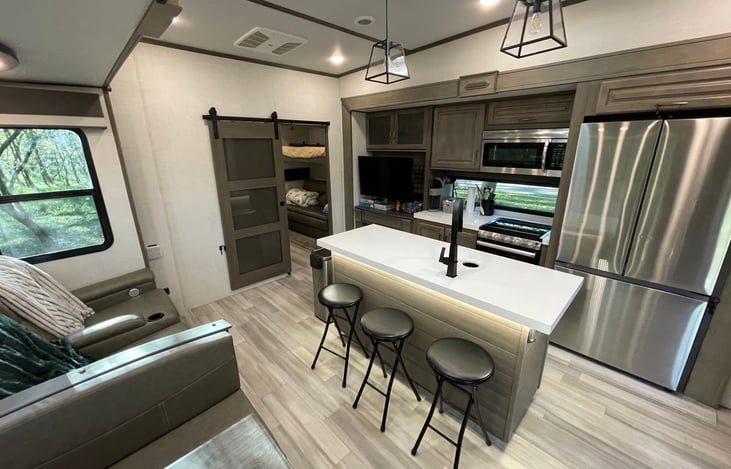 Great open living room and kitchen with island! The separation from the front primary room and rear bunk room is great for everyone’s privacy.