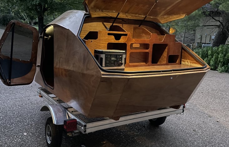 The Chesapeake Light Craft teardrop camper is a small, wooden camper with a sturdy roof rack that can carry two kayaks. It has the following Large doors on both sides. This was build by a local craftsman from a kit.
