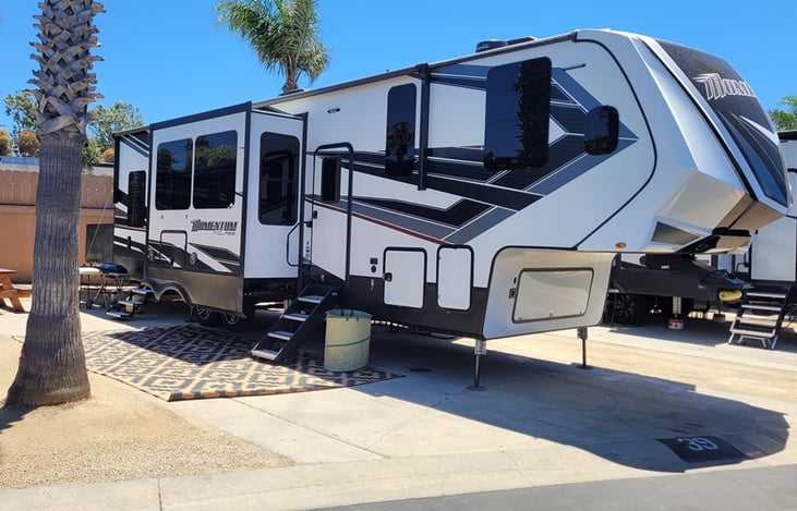 Rent our luxurious 2021 Grand Design Momentum M-Class 351M fifth-wheel toy hauler! This top-of-the-line, 36-foot trailer sleeps 7 people and comes with all the amenities you need for a comfortable trip.