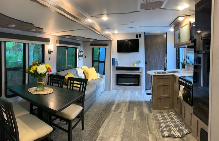 This amazing brand new RV has kingsize master, queen size bedroom and 2 bathrooms! Nice kitchen area, dining room table sofa bed and a fireplace for those chilly nights.