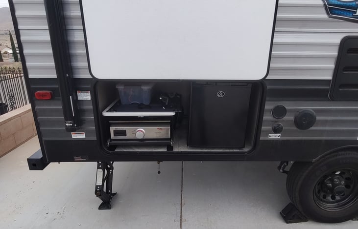Great trailer for the weekend it has a small griddle on the outside with a beer fridge. It has a dinnet slide out that turns into a bed. This trailer is in great condition. It has a smart tv, with plenty of storage.