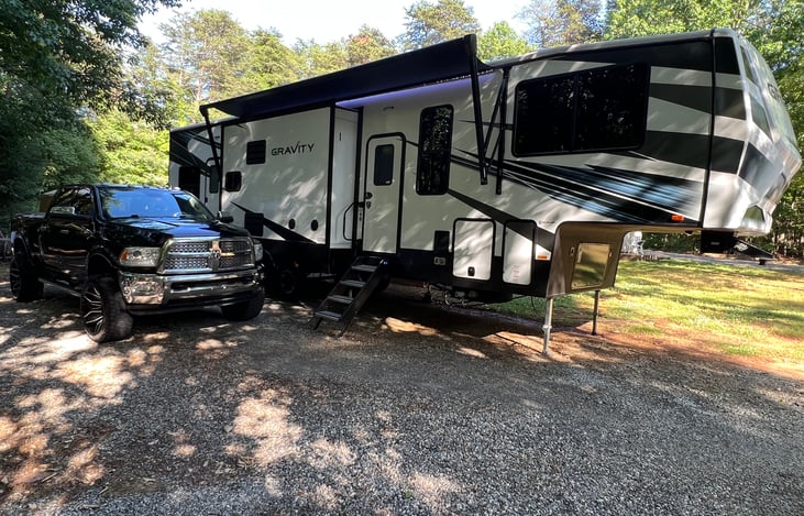 2022 heartland gravity 3550 toy hauler. 43’ rig 11’ garage 4500lb payload. includes kind size bed full shower with 2 queen size beds in rear with half bath. Includes a loft with room for 2-4 children with tv and mattresses. 3 TVs and projector with 120” screen include with rental. Unit is 4 seasons and has dual ac units with optional 3rd unit available.