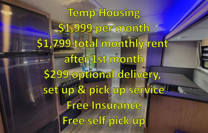 Temp Housing. $1,999 per month. $1,799 total monthly rent after the 1st month. $299 optional delivery, set up & pick up service. Free Insurance. Free self pick up.