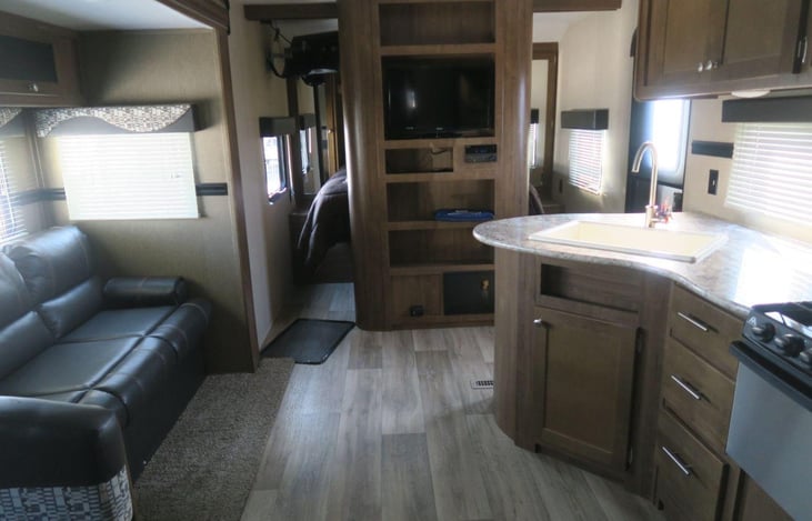 This Aspen Trail camper sleeps 8-10 people. Has lots of room in the kitchen area with a TV and a large dining that collapses into a bed. A sofa that folds out into a bed as well. The Bathroom has an exterior and interior entrance. The Bunk are has to bunk beds with storage areas. Also, there is an outdoor kitchen and shower station.