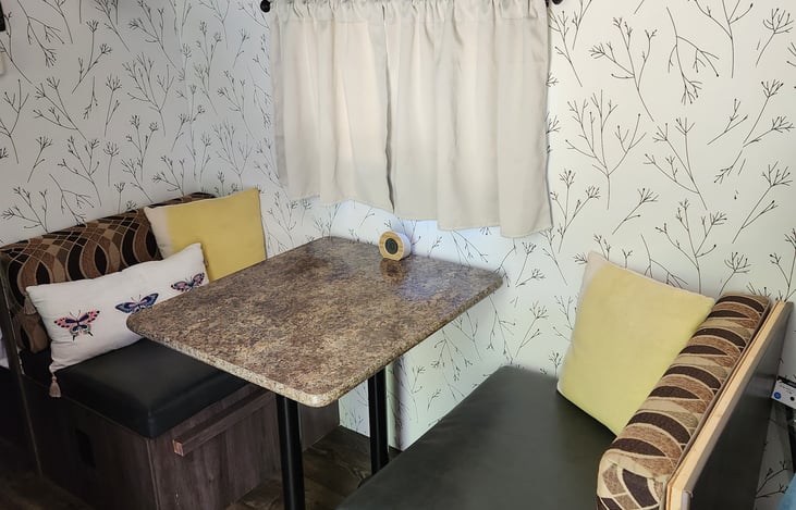 Adorable, renovated, cozy travel trailer available. A queen sized bed with a newly purchased absolutely comfortable mattress is in the main area. Two twin sized bunk beds are at the rear of the trailer. A small dining table is easily converted into a 5th bed if needed. A/C and heating work great and fast.