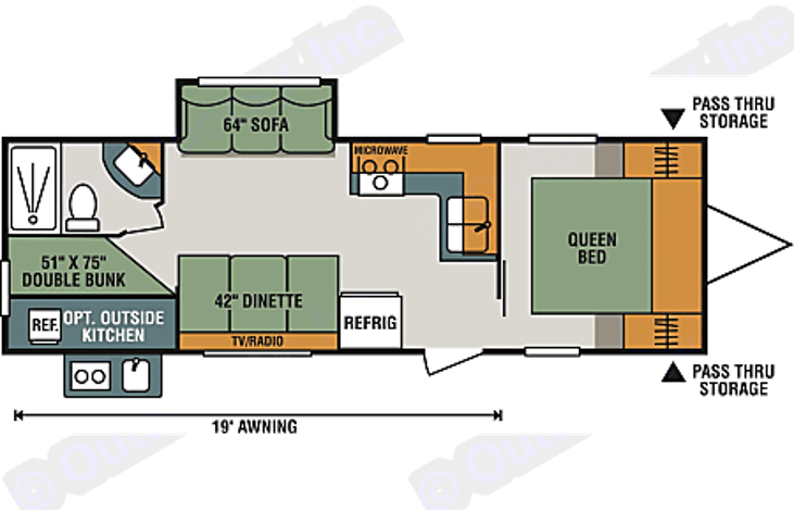This model features sleeping space for up to 8 people and is towable with most SUVs and half ton trucks. It has a front walk around queen bed with a solid door for privacy. The double bed bunks in the rear make it easy for the kids to bring their friends. The outside kitchen allows your family to enjoy the ambiance of outdoor cooking without the mess of campfire prep and cleanup.