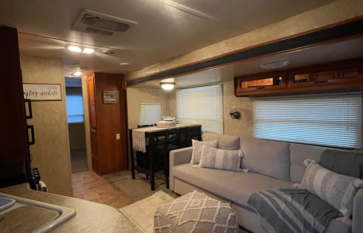 Stephanie was always available to answer any questions. The RV was super clean and had plenty of dishes, pots and pans, bedding, and towels making our stay very comfortable. Stephanie sticks and stages her RV to make it very inviting and a wonderful home away from home. The RV was taken to our location and set up with the AC running, and the outside mat and chairs ready for relaxing.