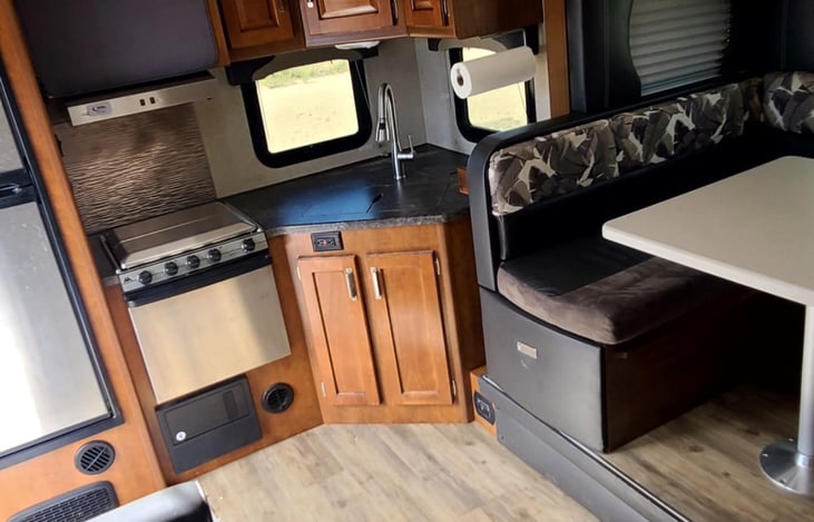 Cruise in style with the Lance. Clean and comfortable. Feel like you’re at home when you’re away from home! Stainless steel appliances. Leather couches, brand new mattress.