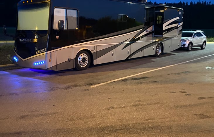 Very clean and spacious RV. Large flatscreen TV with fireplace. Has two bathrooms, a washer and dryer and shower. Full size refrigerator and an additional TV in bedroom above a queen size bed. Fully stocked and ready to go!