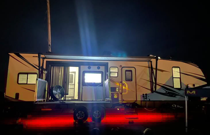 Spacious toyhauler with fold down side deck with outdoor TV. Sliding glass door to 12’ garage area. Linens supplied with camper.
