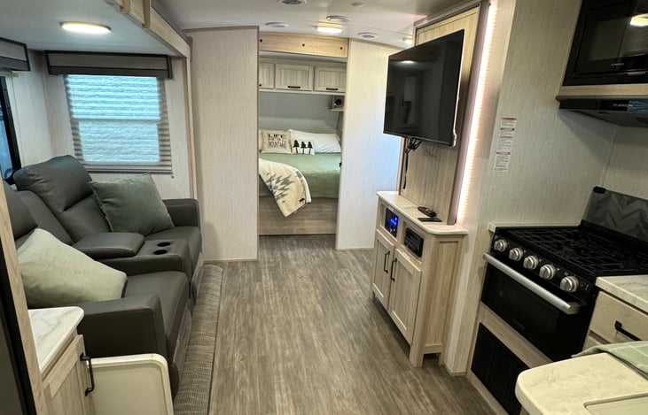 Hello! We have a 2023 Cruiser Twighlight Signature. It has provided my family with many adventures, and now yours too! Perfect size for a couple's getaway in style with a king size bed, theater recliner seats, outdoor kitchen, and walk-in pantry!