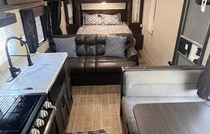 Clean 26ft interior space travel trailer. Has 2 double bunks in the rear and plenty of space for a family with the open concept design. Queen size master bed has its own tv. Very spacious bathroom and big kitchen sink. Also includes dog leash hook outside for your furry friend, and outdoor shower. Very light at just 4,500 lb so easy to tow with full size truck.