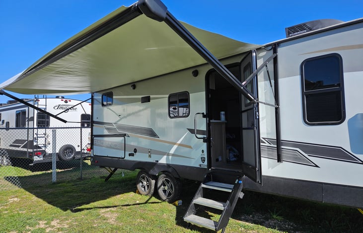 This 2022, 29 ft, family-friendly RV has TWO A/C units for maximum comfort on those Texas summer days! Complete with two full size bunks for the kids and a king bed (in a private room) for the grown ups, this camper is ready for your adventure! The indoor and outdoor kitchens make remote cooking a breeze. Relax under the awning and play your tunes on the Bluetooth speakers.