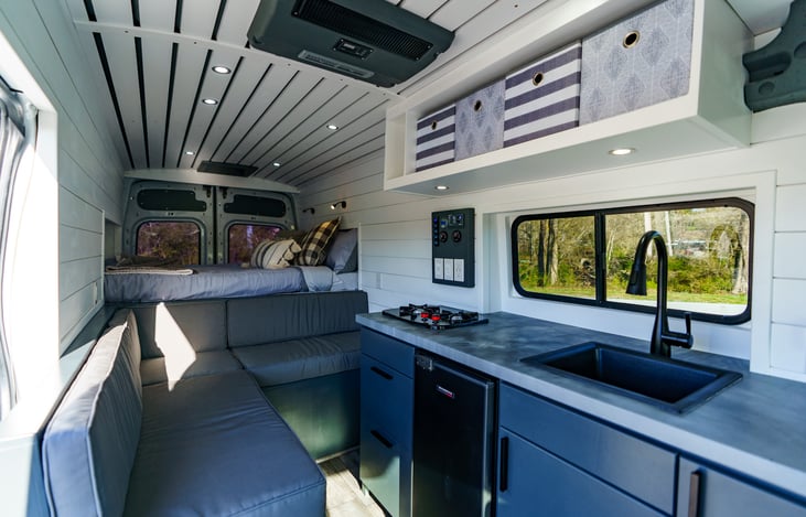 Make way for a trip filled with nothing but peace and relaxation in this one of a kind, cozy campervan! With a wrap-around sofa, large kitchen space, queen size bed, and plenty of storage- this van is perfect for both midday entertaining and late night relaxation!