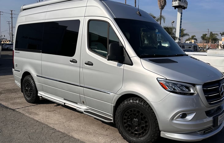 Fully Loaded Super Stylish top of the line Mercedes Airstream 19’ luxury Camper Van. Grey exterior and white interior.