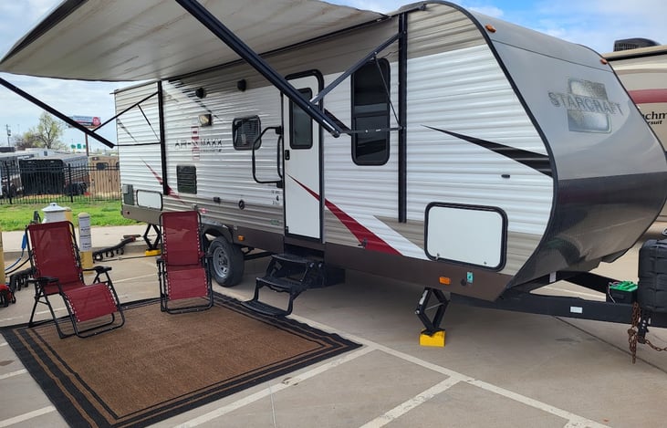 Spacious travel trailer with a slide out, perfect for 6-8. Sleeps 6 comfortably and is fully stocked with everything you need for your trip. Contains queen sized bed and mattress protector, fold out beds, TV, pots, pans, first aid kit, cups, plates, bowls, etc. All full list of provided items are available upon request.