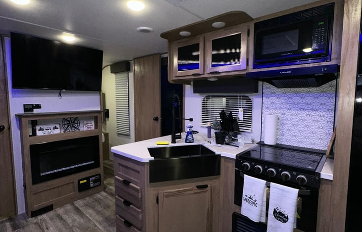 Hey there! Let me introduce you to Wolfy, a Luxurious new RV trailer from 2024 that can comfortably accommodate 8 people. Get ready for your next adventure in this amazing, fully-equipped trailer. Wolfy provides a convenient electric 20’ awning that can be effortlessly operated with a button push. Plus, it's equipped with stabilizing jacks at all four points for added stability.