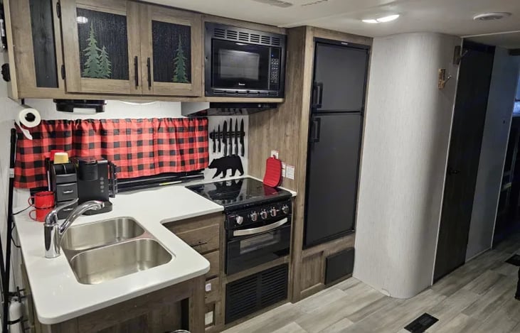 This bunkhouse travel trailer has everything you need to take your family on a Mountain View adventure without heading to the ski lodge! With unlimited hot water, everyone can shower as long as they want, even in the outdoor shower. The outdoor kitchen with a fridge and large master closet make this travel trailer a comfort you can’t match.